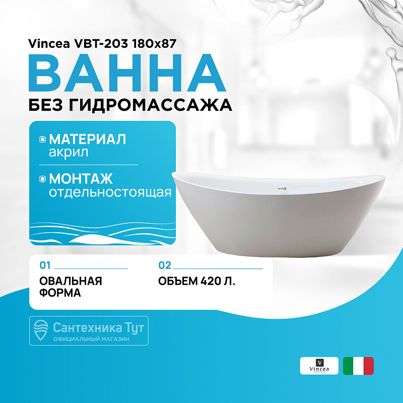 Акриловая ванна Vincea VBT-203 180x87 без гидромассажа информация:
