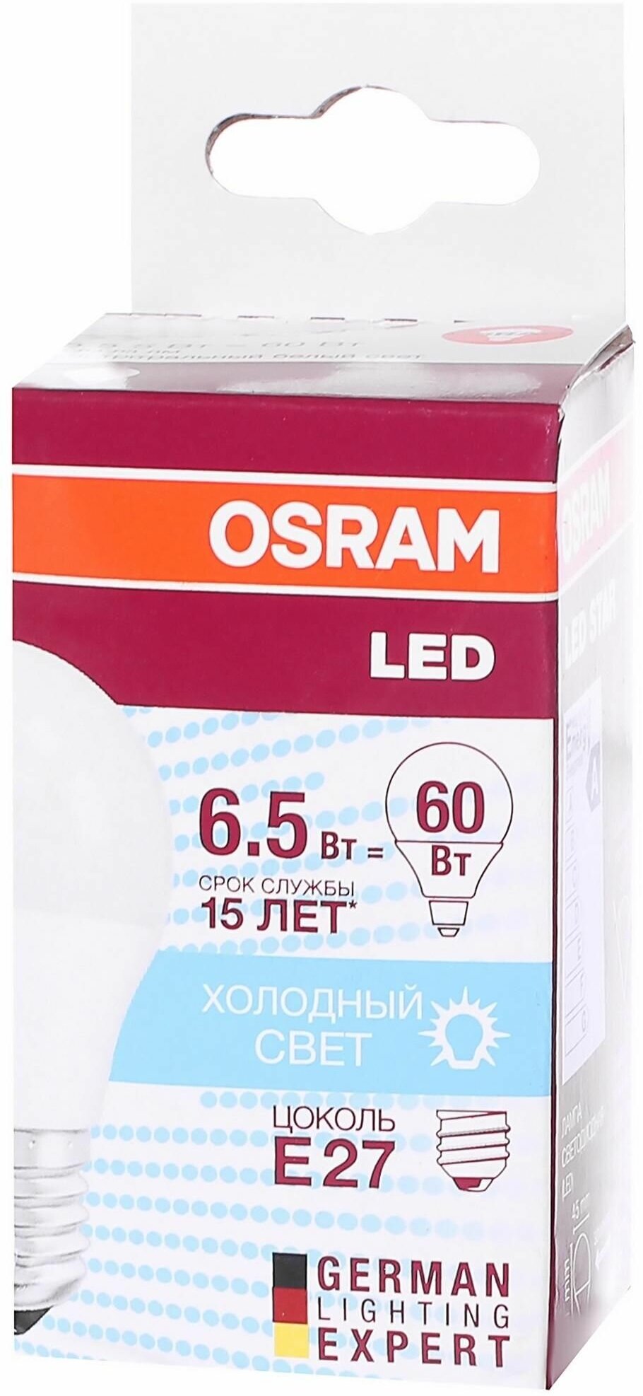 "Лампа светодиодная Osram Шар , E27, 6.5 Вт, 550 Лм, свет тёплый белый" информация: