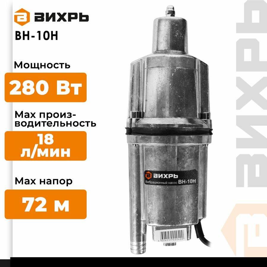 Вибрационный насос ВН-10Н Вихрь, 280 Вт, нижний забор, напор до 72м, 2 353 ₽