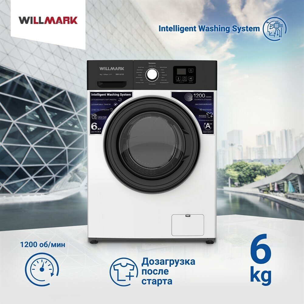 Стиральная машина WILLMARK WMF-6012B (6кг/1200 об,16 реж, доз. белья, очист. бар, A++, белый+чёрн.) информация: