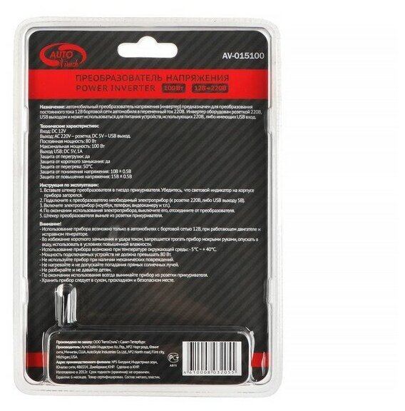 Преобразователь напряжения-инвертер Autovirazh AV-015100, 12 В-220 В, USB