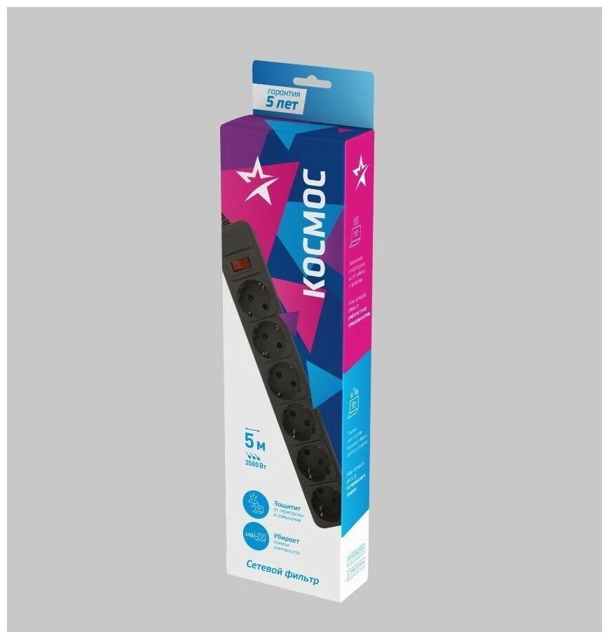 Сетевой фильтр Космос Электро Космос 6х5м с заземл. 16А IP20 3.5кВт с пред. 3х1 индик. сети, черный, FKsm5m-6g(B)16A информация: