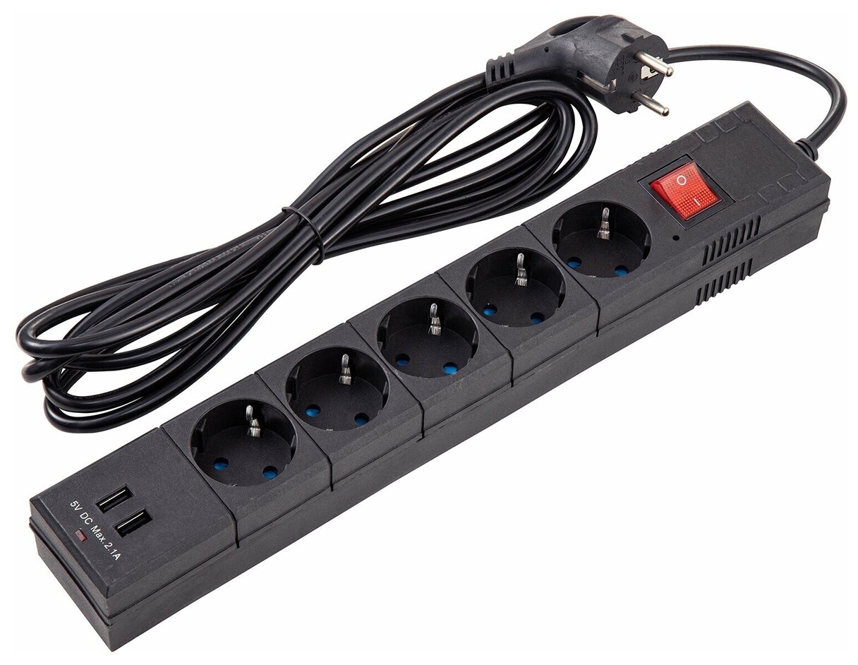 Сетевой фильтр Duwi, 5 гнезд, 2 USB-порта, с заземлением, 3м, цвет: черный