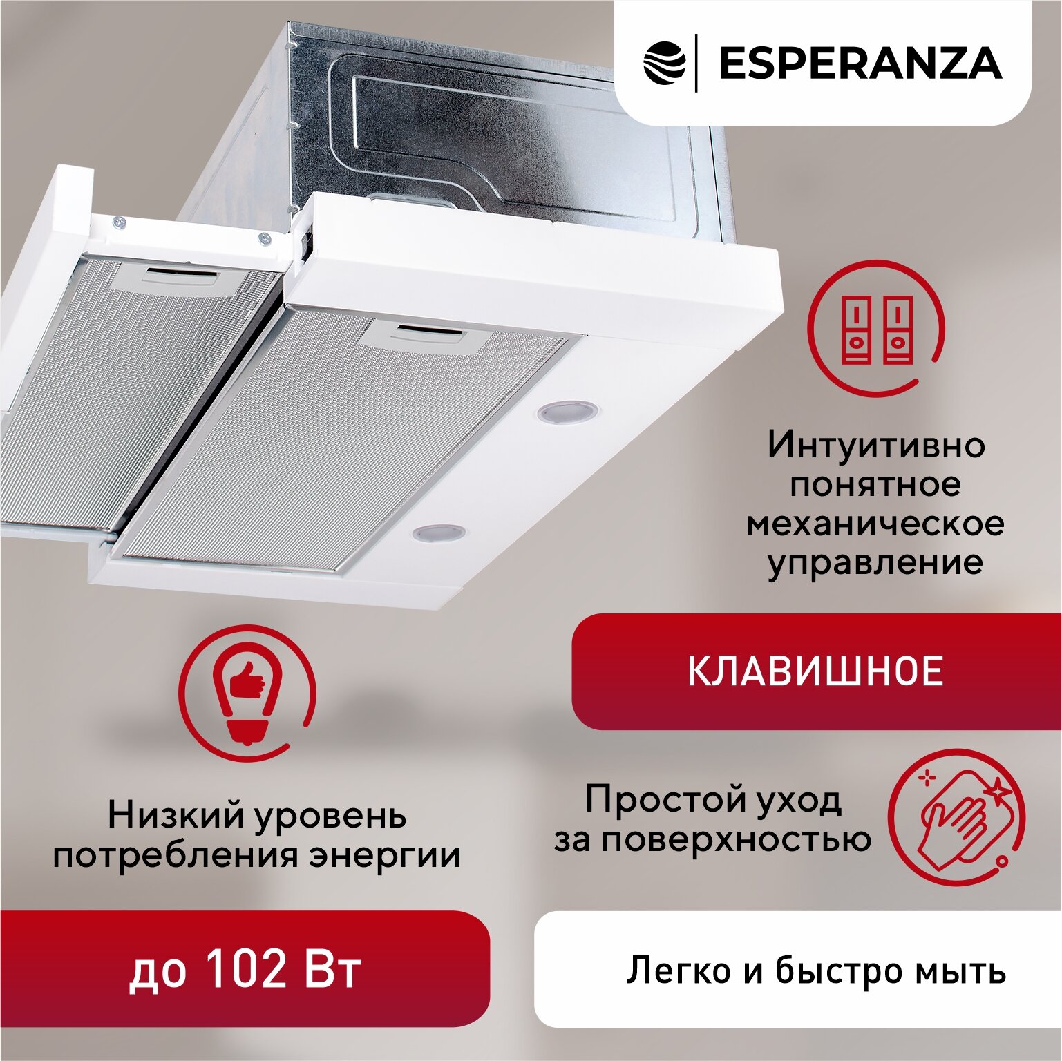 Вытяжка кухонная встраиваемая на 60 см ESPERANZA RHT60S01 W, производительность 450 м3ч, гарантия 5 лет, белый 7 650 ₽