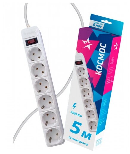 Сетевой фильтр Космос 5 м 6 гнезд 16A белый информация: