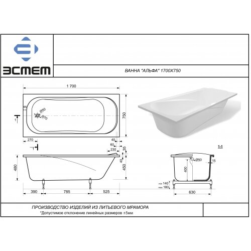 Ванна из литьевого мрамора Эстет Альфа 170x70 белая без гидромассажа информация: