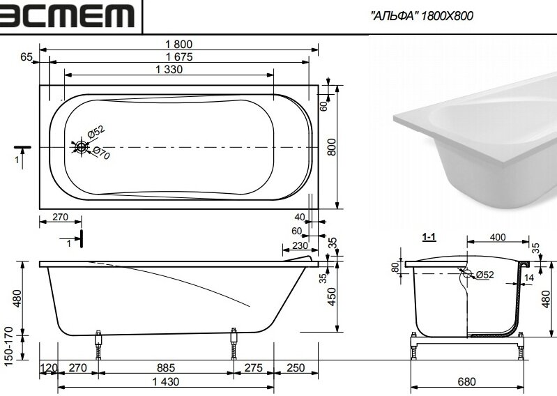Ванна из искусственного камня Эстет Альфа 180x80 белая информация: