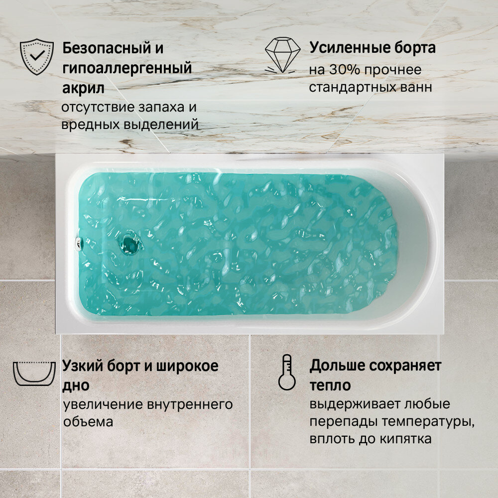 Ванна акриловая AM.PM Func W84A-160-070W-A 160x70 см, полка для хранения, декоративная заглушка слива, усиленный корпус, гарантия 15 лет