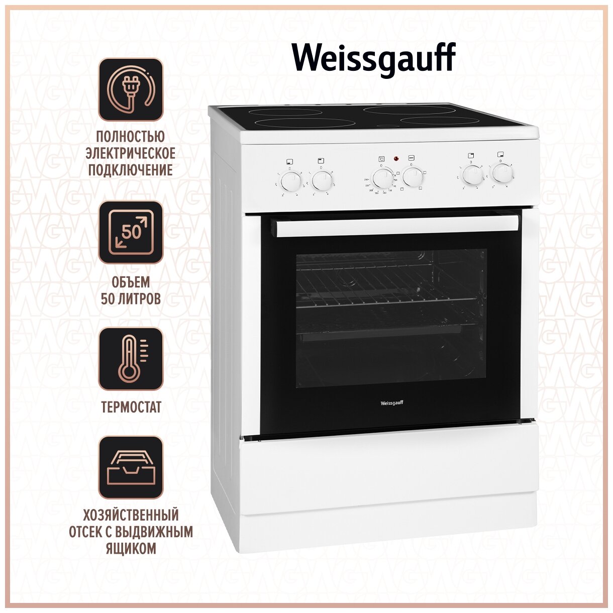 Электрическая плита Weissgauff WES E1V07 W 3 года гарантии, Объем 50 литров, Технологичные поворотные переключатели Soft Switch, Термостат духового шкафа 38 100 ₽