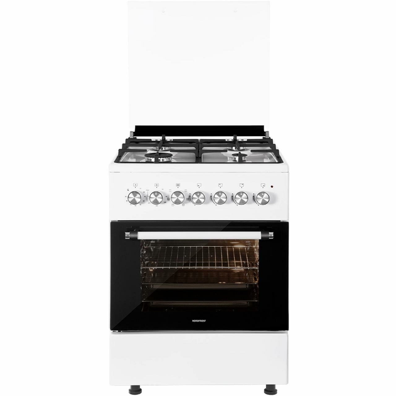 10 цен на Газоэлектрическая плита NORDFROST GE 6064 W, 63 литра, газ-контроль конфорок, авторозжиг, конвекция, белый