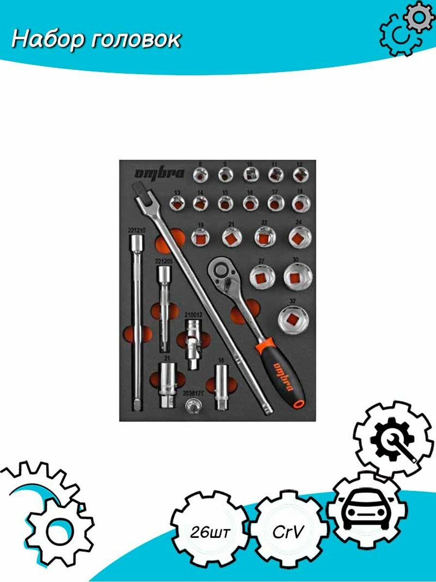 Ombra OMT26STE Набор головок торцевых 1/2" DR с аксессуарами в EVA ложементе 280х375 мм, 26 предметов информация:
