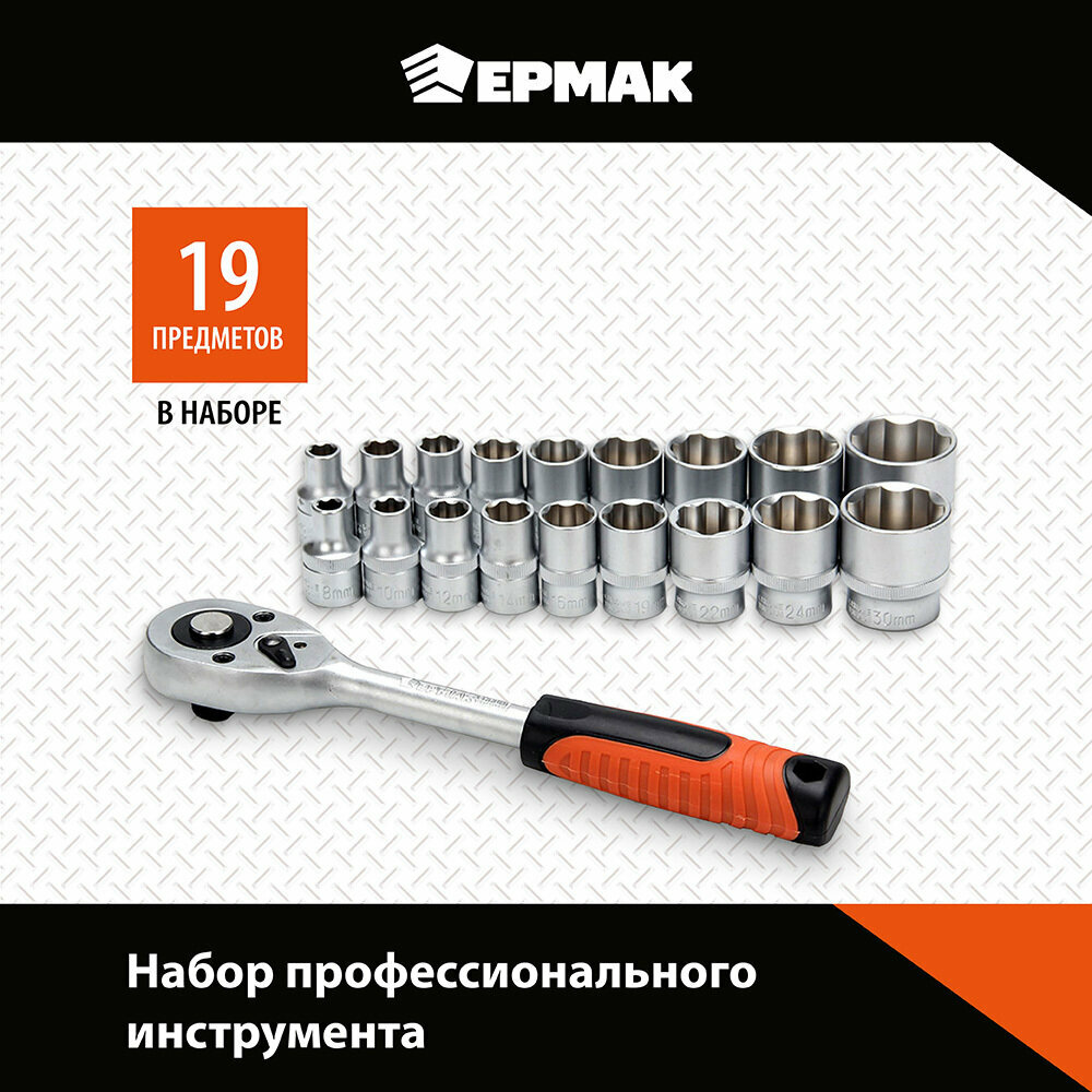 Ермак Набор профессионального инструмента, 19 предм., 1/2" (головки и трещотка)