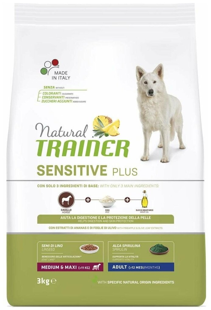 Отзывы на TRAINER NATURAL SENSITIVE PLUS MEDIUM & MAXI ADULT HORSE & RICE безглютеновый для взрослых собак средних и крупных пород с кониной и рисом (12 кг)