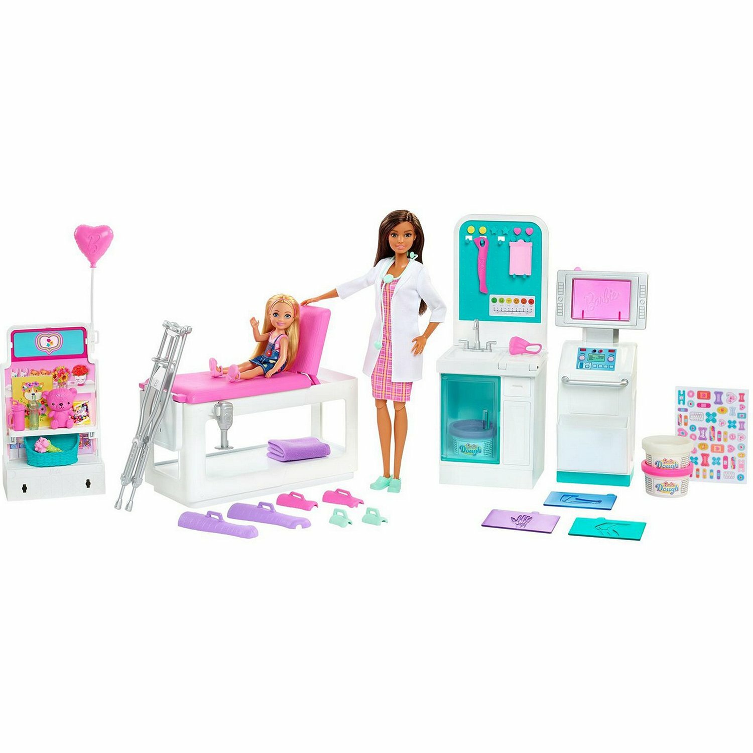 | Комплектация | кукла-доктор Барби (брюнетка) и 4 игровые зоны: медицинский пункт, смотровой стол, рентгеновский аппарат и сувенирный магазин, 30 предметов для игры в доктора: 3 контейнера теста, гипс для ног, гипс для рук, набор костылей, наклейки, рентгеновские снимки, предметы для сувенирного магазина при больнице и многое другое |