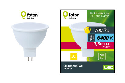 Лампа светодиодная FOTON LIGHTING FL-LED MR16 7.5W 12V GU5.3 6400K 56xd50 информация: