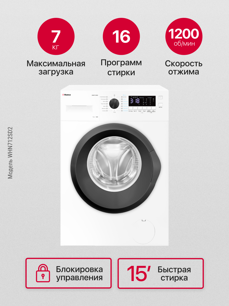 Стиральная машина Hansa WHN712SD2, класс A++ 1200 об/мин, до 7 кг, бело-чёная 9601762