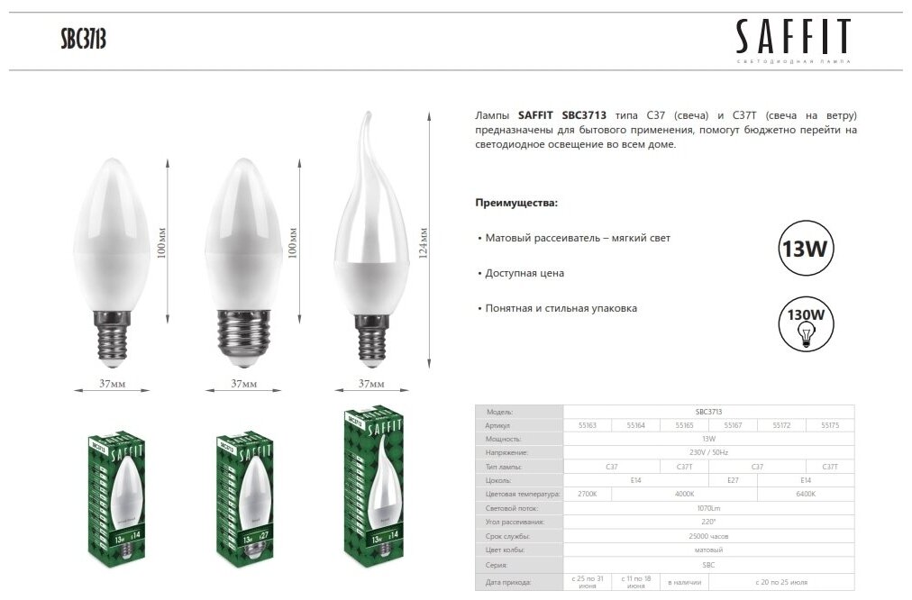 Лампочка светодиодная Saffit 13Вт 230V E14 4000K C37, SBC3713, 55164 информация: