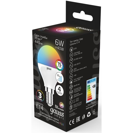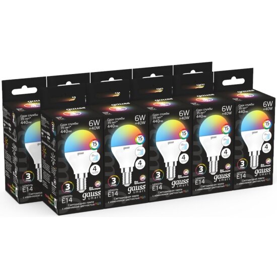 Лампа Gauss Smart LED, шар, G45, 6W, E14, RGBW+dim, 1/10/100 105101406