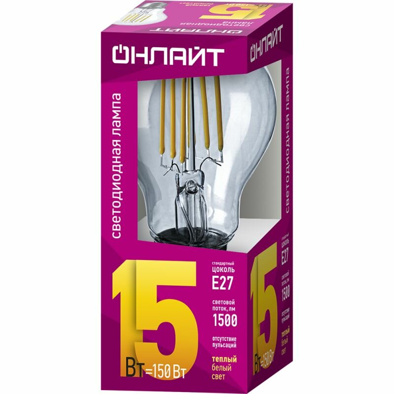 Лампа светодиодная филаментная 80 878 OLL-F-A60-15-230-2.7K-E27 15Вт грушевидная прозрачная 2700К тепл. бел. E27 1500лм 220-240В онлайт 80878 информация: