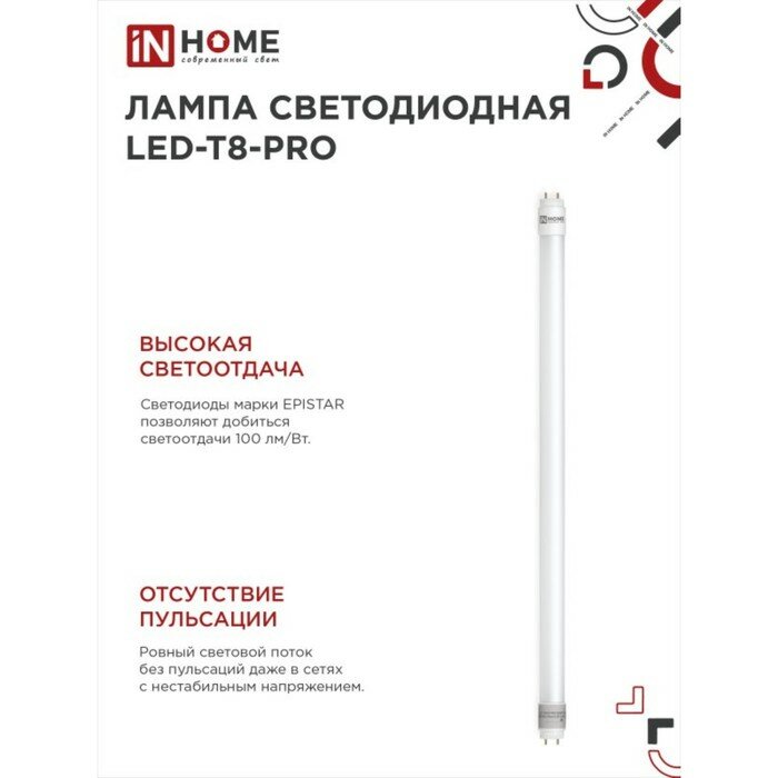 Лампа светодиодная IN HOME LED T8 М PRO, G13, 10 Вт, 230 В, 6500 К, 800 Лм, 600 мм, матовая./В упаковке шт: 1