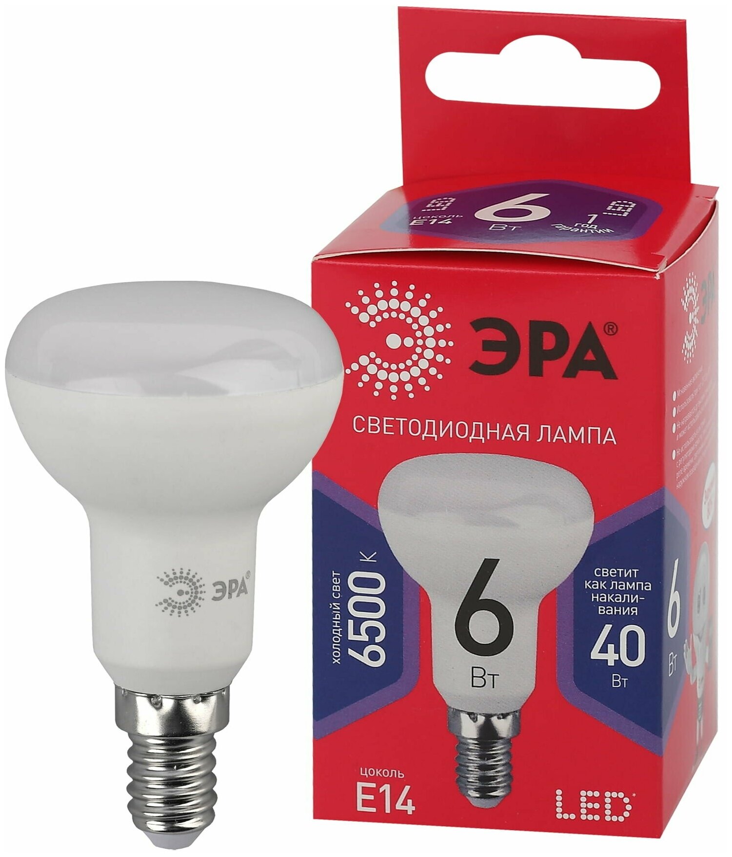 ЭРА LED R50-6W-865-E14 R ЭРА (диод, рефлектор, 6Вт, хол, E14) (10/100/3600)