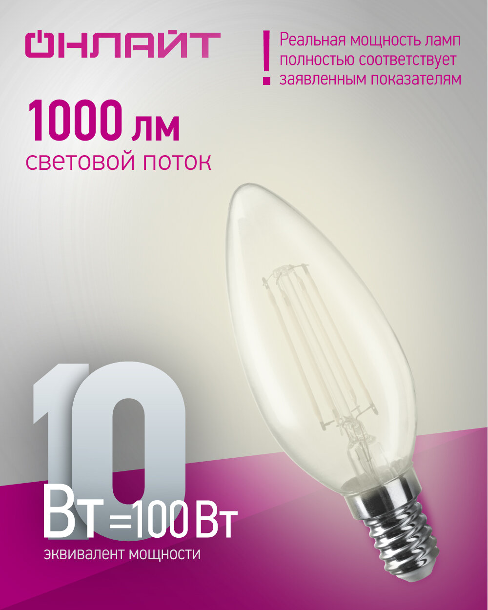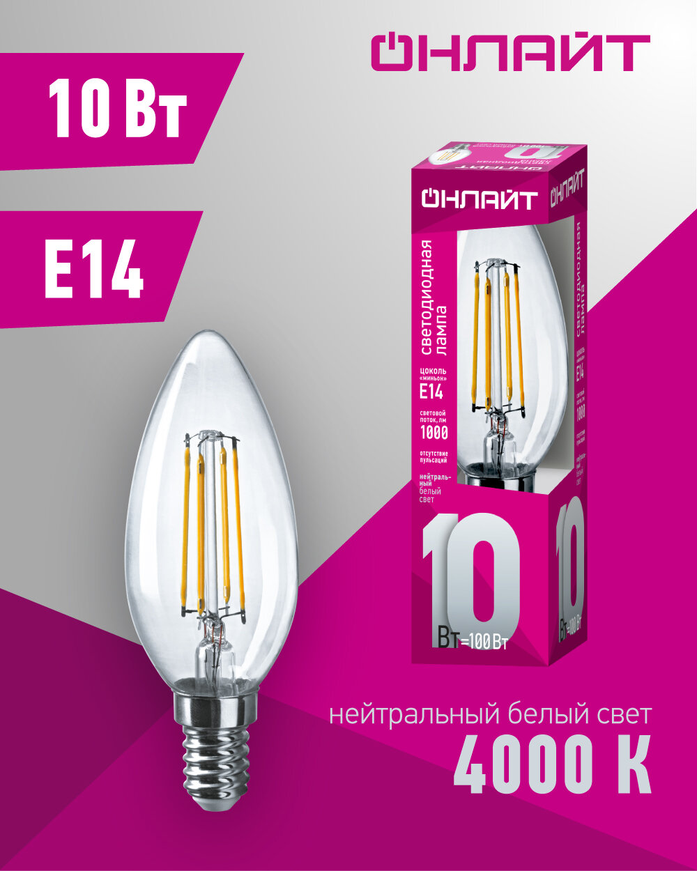 Лампа светодиодная филаментная онлайт 80 895, 10 Вт, свеча Е14, дневной свет 4000К, 1 шт. 169 ₽