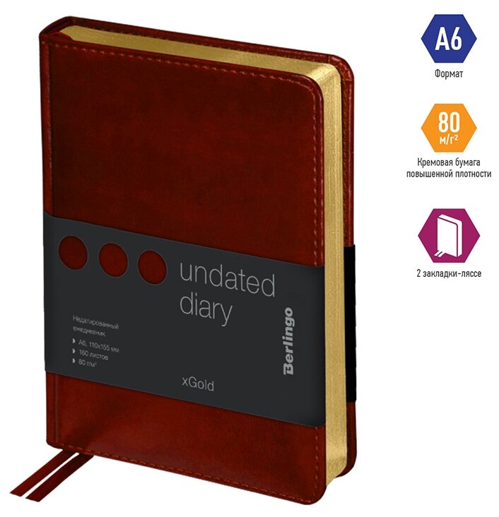 Ежедневник недатированный Berlingo A6, 160 листов, кожзам, "xGold", золотой срез, бордовый (UD0_81604)