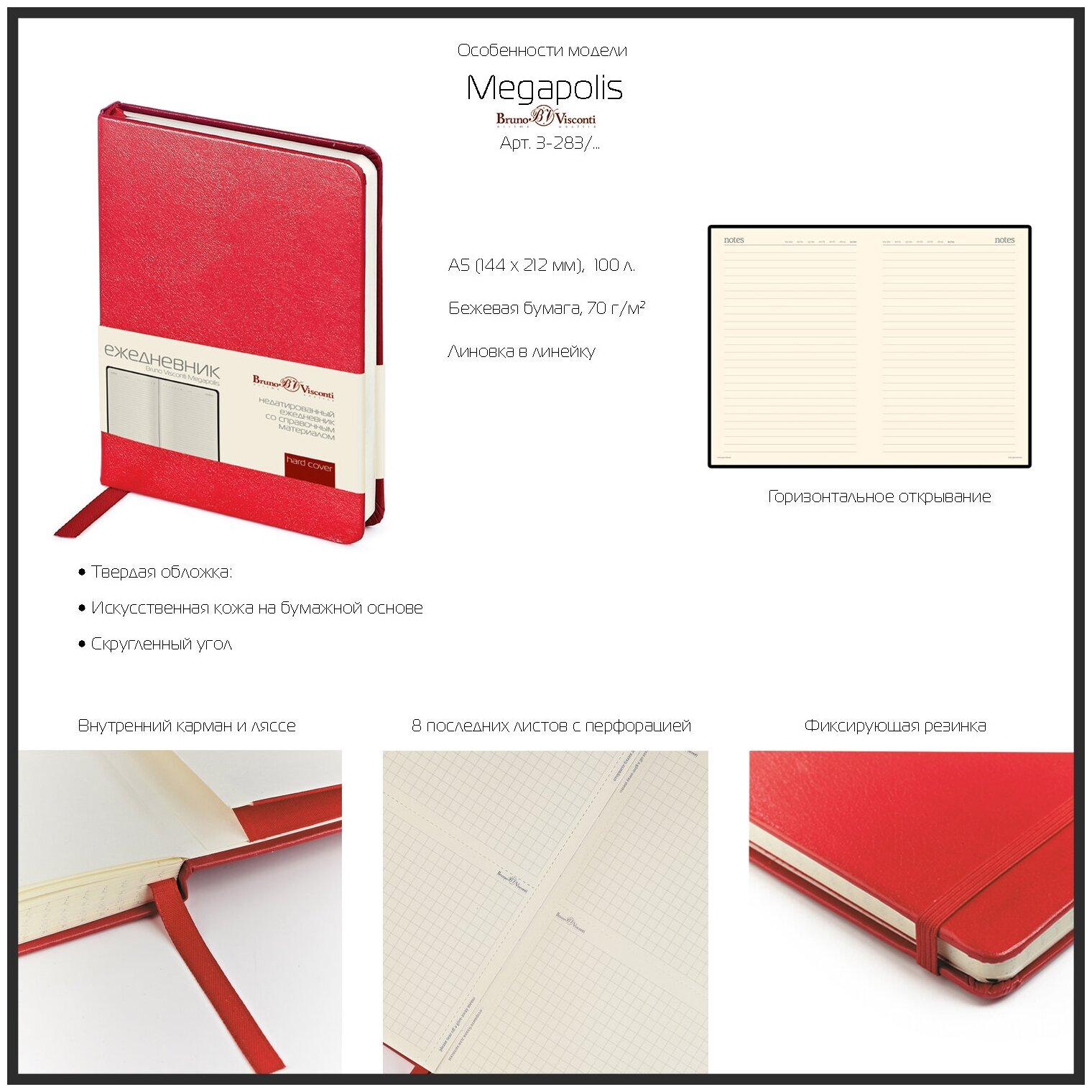Ежедневник недатированный А5, 160 листов Megapolis, твёрдая обложка, искусственная кожа, красный