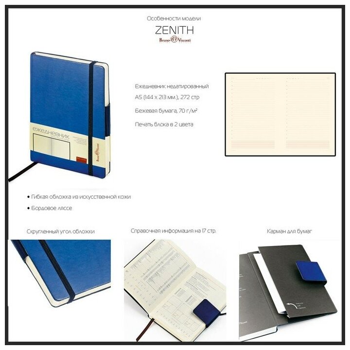BrunoVisconti Ежедневник недатированный А5, 136 листов ZENITH, обложка искусственная кожа, тёмно-синий информация:
