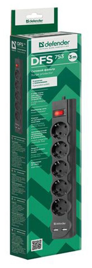 Сетевой фильтр Defender DFS 753, 3.0м, 5 розеток, 2 USB, с выключателем, цвет: чёрный информация: