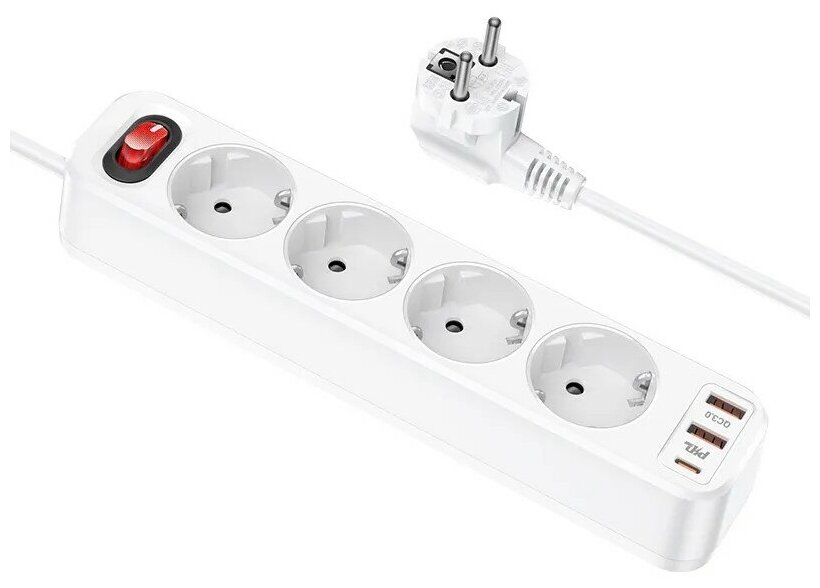 Сетевой фильтр NS3 / Разветвитель электрический / 1 розетка 4000W / Выходы 2xUSB QC3.0, 18W / Type-C PD20W / Белый