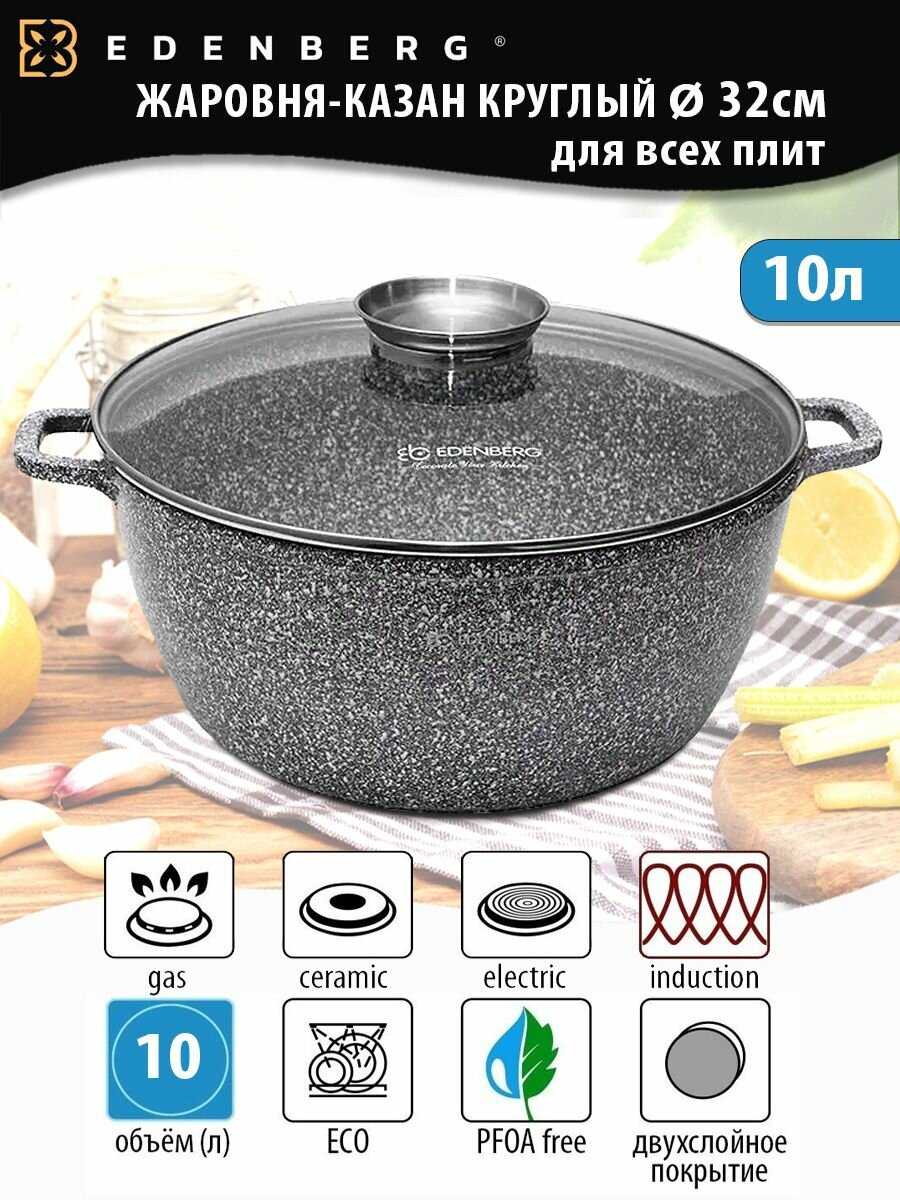 10 цен на Казан с крышкой Edenberg 10л 32см для всех видов плит / Сотейник / Жаровня / посуда / индукционной / газовой / для готовки / плова / дома / духовки
