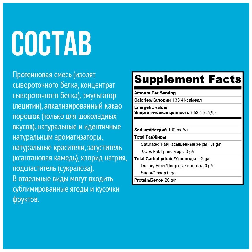 | Дополнительная информация | рекомендации по применению: Для приготовления коктейля 35 гр добавки (2 мерных ложки) смешайте с 250 мл воды или обезжиренного молока. Перемешайте в шейкере или блендером для получения однородной консистенции. Принимайте в день по 2 порции – за полчаса до тренировки и сразу после нагрузок. В дни отдыха – утром и между приемами пищи.; состав: протеиновая смесь (изолят сывороточного белка, концентрат сывороточного белка), эмульгатор (лецитин), натуральные и идентичные натуральным ароматизаторы, натуральные красители, загуститель (ксантановая камедь), хлорид натрия, подсластитель (сукралоза). В отдельные виды могут входить сублимированные ягоды и кусочки фруктов. |