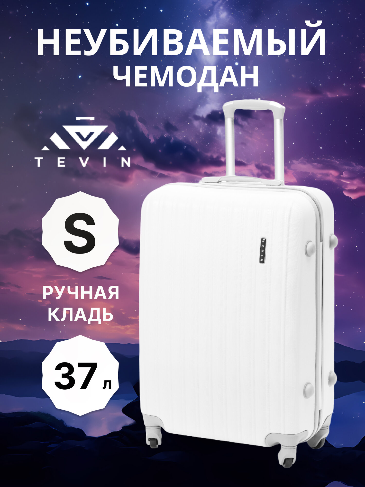 Чемодан на колесах дорожный ручная кладь в самолет s TEVIN размер С маленький 55 см ручной 37 л cabin 21" легкий 2.5 кг прочный abs пластик Белый информация: