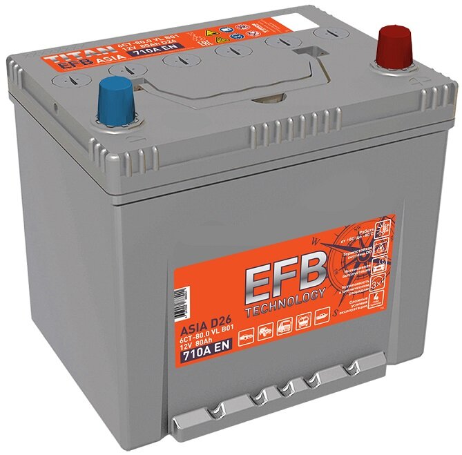 Аккумулятор автомобильный TITAN ASIA EFB 80 А/ч 710 А обр. пол. Азия авто (260x171x221) с бортиком информация: