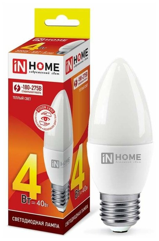 Отзывы на Светодиодная лампа IN HOME LED-СВЕЧА-VC 4Вт, 230В, Е27, 3000К, 360Лм 4690612030111