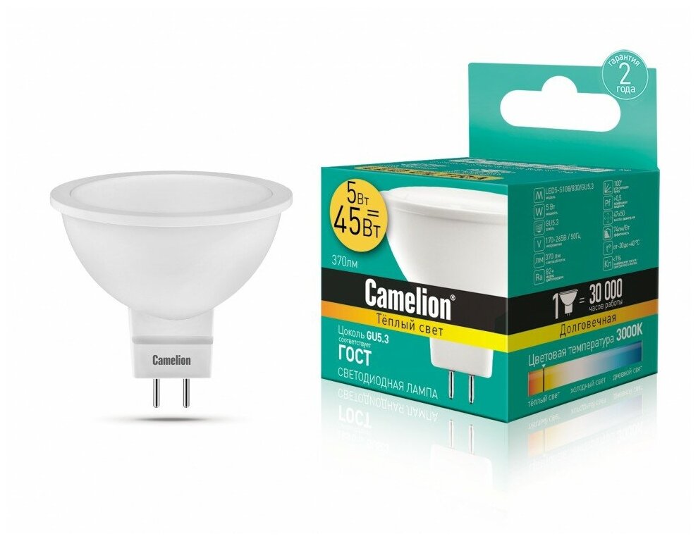 Отзывы на Эл.лампа светодиодная 5W LED5-S108/830/GU5.3 5Вт 220В (JCDR 5W=45Вт 370 Lm) Camelion