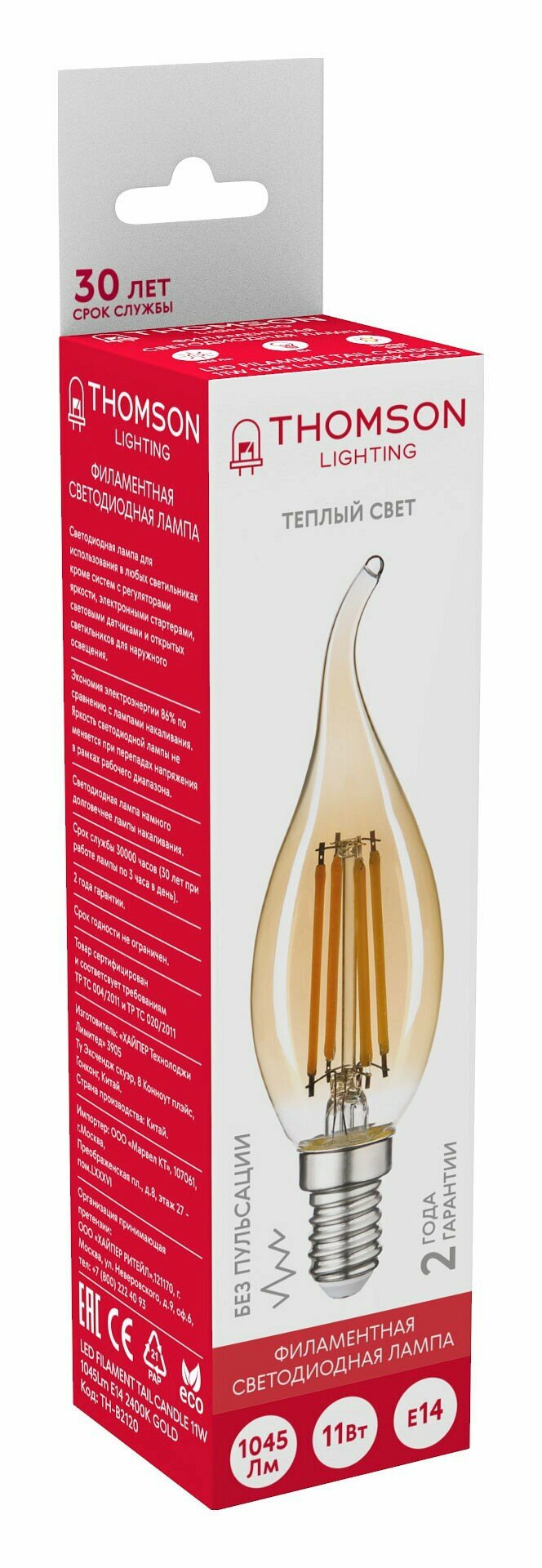 Лампа светодиодная филаментная Thomson E14 11W 2400K свеча на ветру прозрачная TH-B2120 информация: