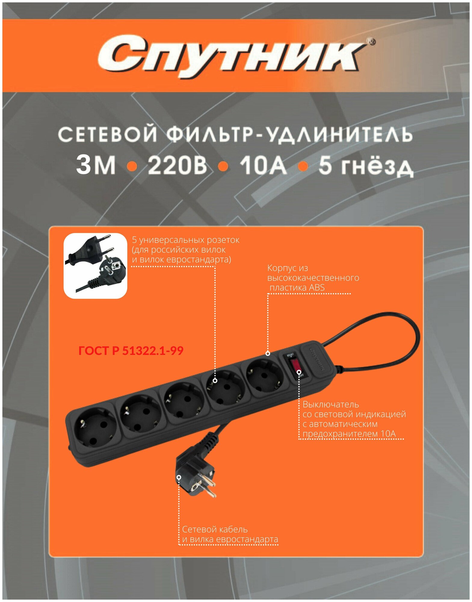 Сетевой фильтр - удлинитель Спутник SP-530 3м, чёрный информация: