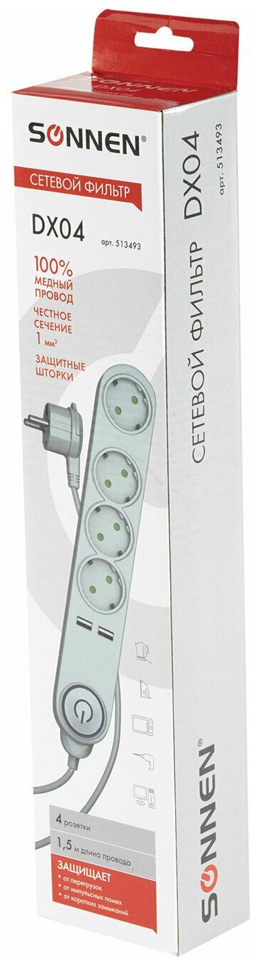 Сетевой фильтр SONNEN DX04, 4 розетки, 2 USB-порта, заземление, 10А, длина 1,5м, белый, 513493 информация:
