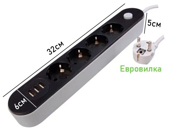 Сетевой фильтр, 4 евро-розетки, 3 USB с синей подсветкой, 3 метра Сетевой удлинитель информация: