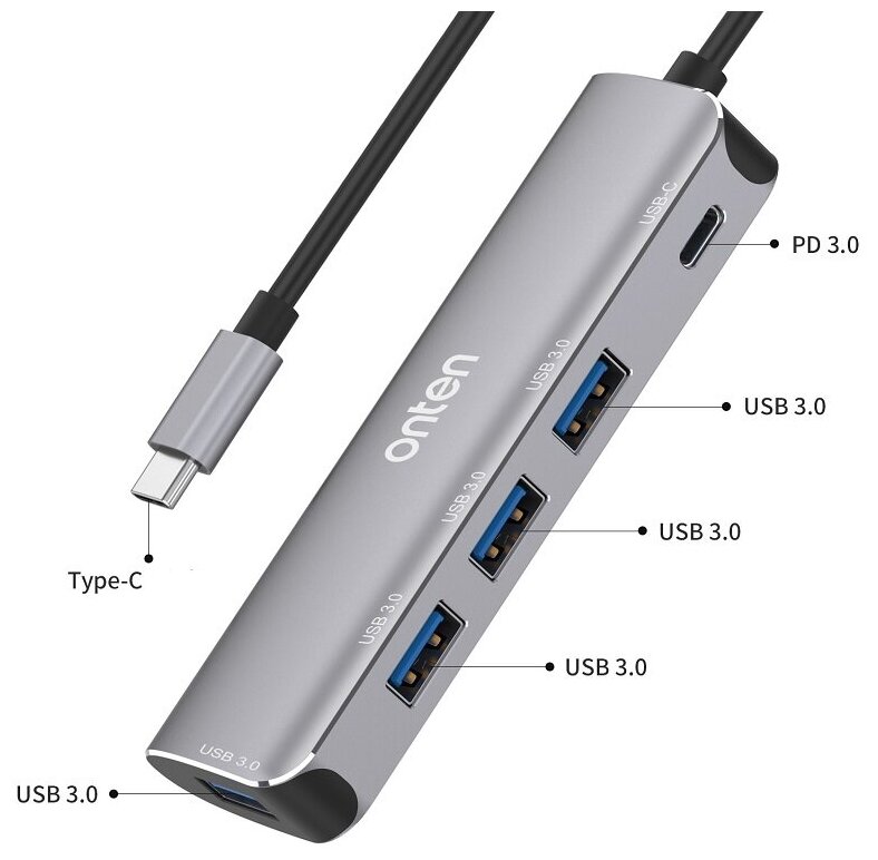 10 цен на Разветвитель адаптер переходник концентратор Type-C USB-C HUB Хаб 4 порта USB 3.0+PD Onten OTN-95116S серый
