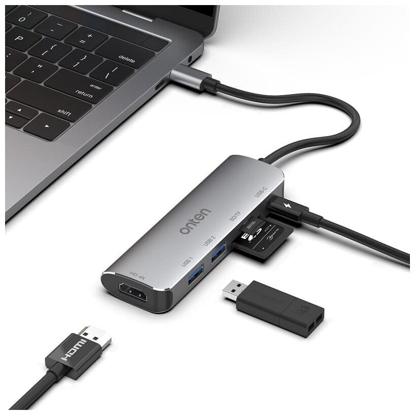 10 цен на Разветвитель адаптер переходник концентратор Type-C HUB Хаб док станция 6в1 2 порта USB 3.0/SD/TF/HDMI/PD 3.0 Onten OTN-95116 серый