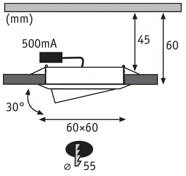 | Ширина/диаметр врезного отверстия | 55 мм |