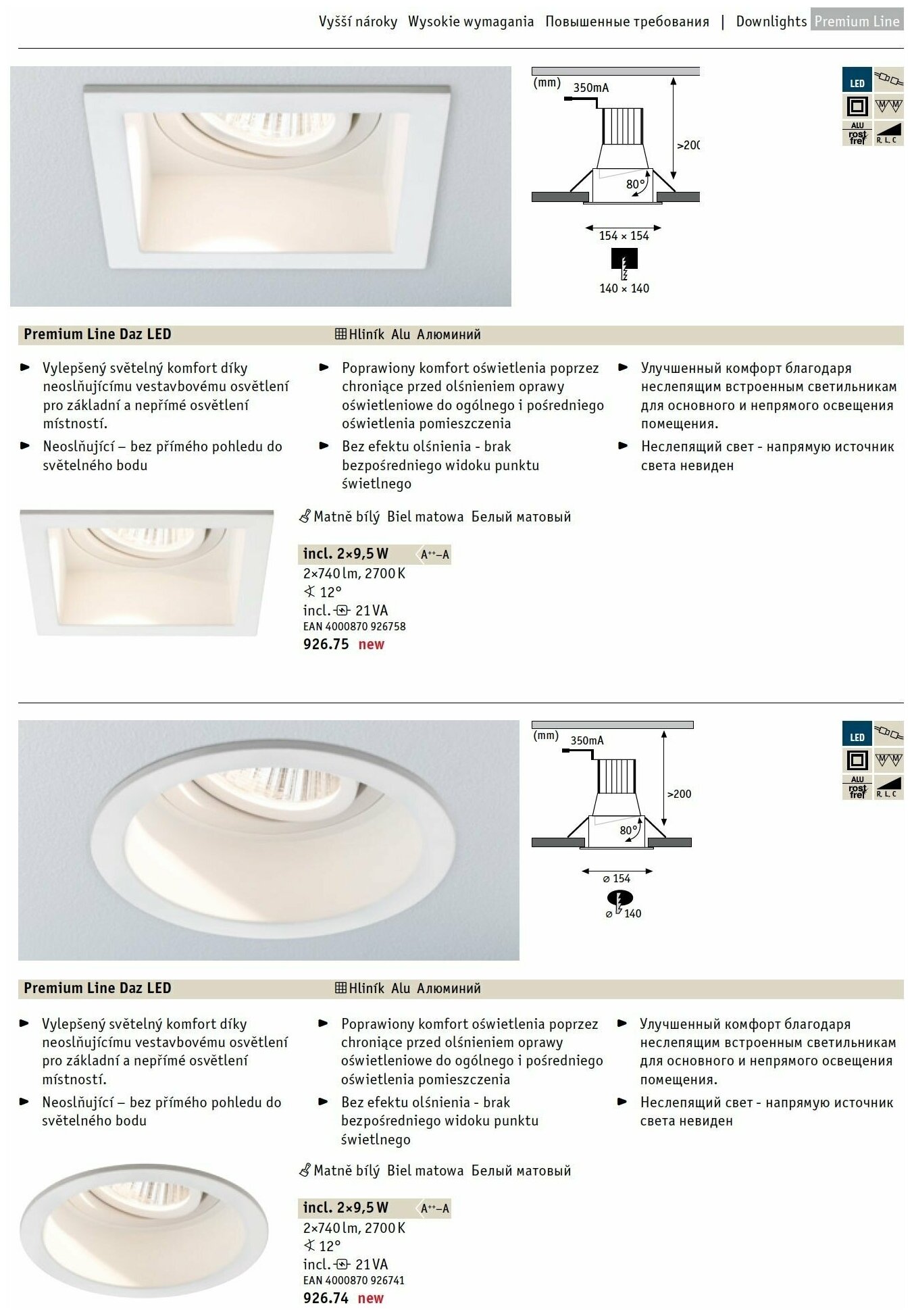 Отзывы на Светильник встраиваемый Paulmann Premium Line Daz LED 9.5Вт 740Лм 2700К 230В/12В Белый мат. Димм Набор 2 штуки 154x154мм 92675
