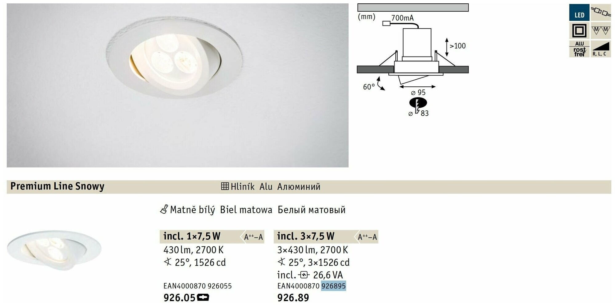Светильник встраиваемый Paulmann Premium Snowy D95мм 7.5Вт 430Лм 2700К LED Белый Алюм Набор 3 штуки 92689 информация: