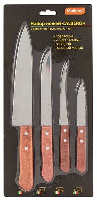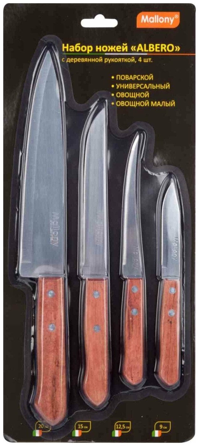 Набор ножей Mallony с деревянной рукояткой ALBERO 4 шт (поварской, универсальный, овощной, овощной малый) 710 ₽