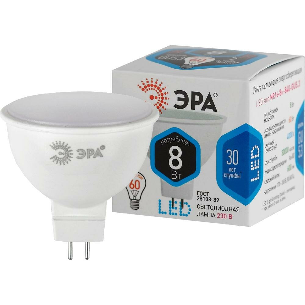Лампа светодиодная ЭРА, 8 (60) Вт, цоколь GU5.3, MR16, холодный белый свет, 30000 ч., LED smdMR16-8w-840-GU5.3 В комплекте: 3шт.