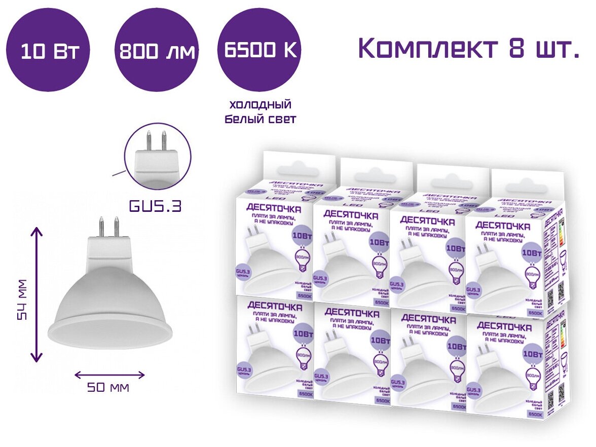 Лампа светодиодная Десяточка MR16 10 Вт 6500 К GU5.3 / Комплект 8 шт информация:
