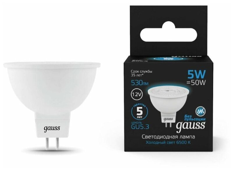 Отзывы на Gauss Лампа MR16 12V 5W 530lm 6500K GU5.3 LED 2 шт (арт. 201505305)